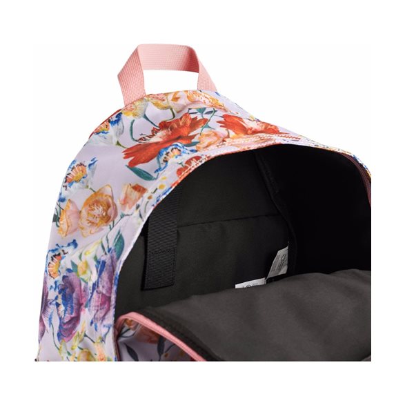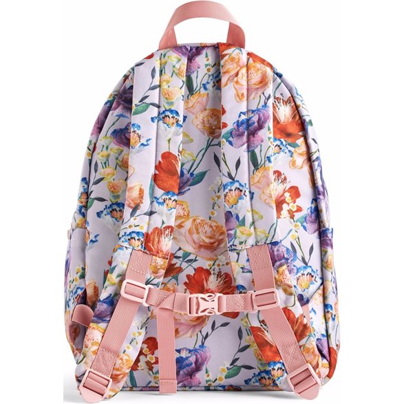 Fin Molo ryggsäck i ljuslila med ett färgglatt blommönster över hela väskan.Molo ryggsäcken består av ett stort fack som öppnas med en dubbelt dragkedja på toppen. Inuti finns en praktisk avdelare med kardborreknäppning och en vadderad ryggpanel. På varje sida finns ett öppet fack för t ex en vattenflaskan, och på framsidan finns ett fack med dragkedja för en matsäck eller småsaker.Ryggsäcken har vadderade och justerbara axelremmar som kan fästas på magen med ett klickspänne. På toppen finns ett praktiskt handtag så att väskan kan bäras i handen.